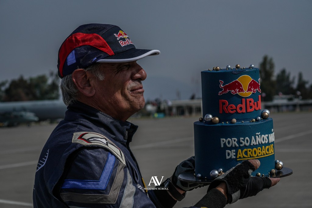 El experimentado piloto, cumplió en FIDAE, 50 años surcando los cielos. Su experiencia data en aviación comercial habiendo volado para Aerolíneas Argentinas Boeing 707, 727 y 747, y luego dedicado a la aviación civil haciendo espectaculares acrobacias en distintas aeronaves. Se realizó una pequeña ceremonia que incluyo a su familia, amigos con torta de cumpleaños, se realizó cuando llegó con su Extra-300 después de su rutina de acrobacias.